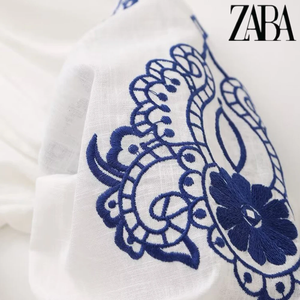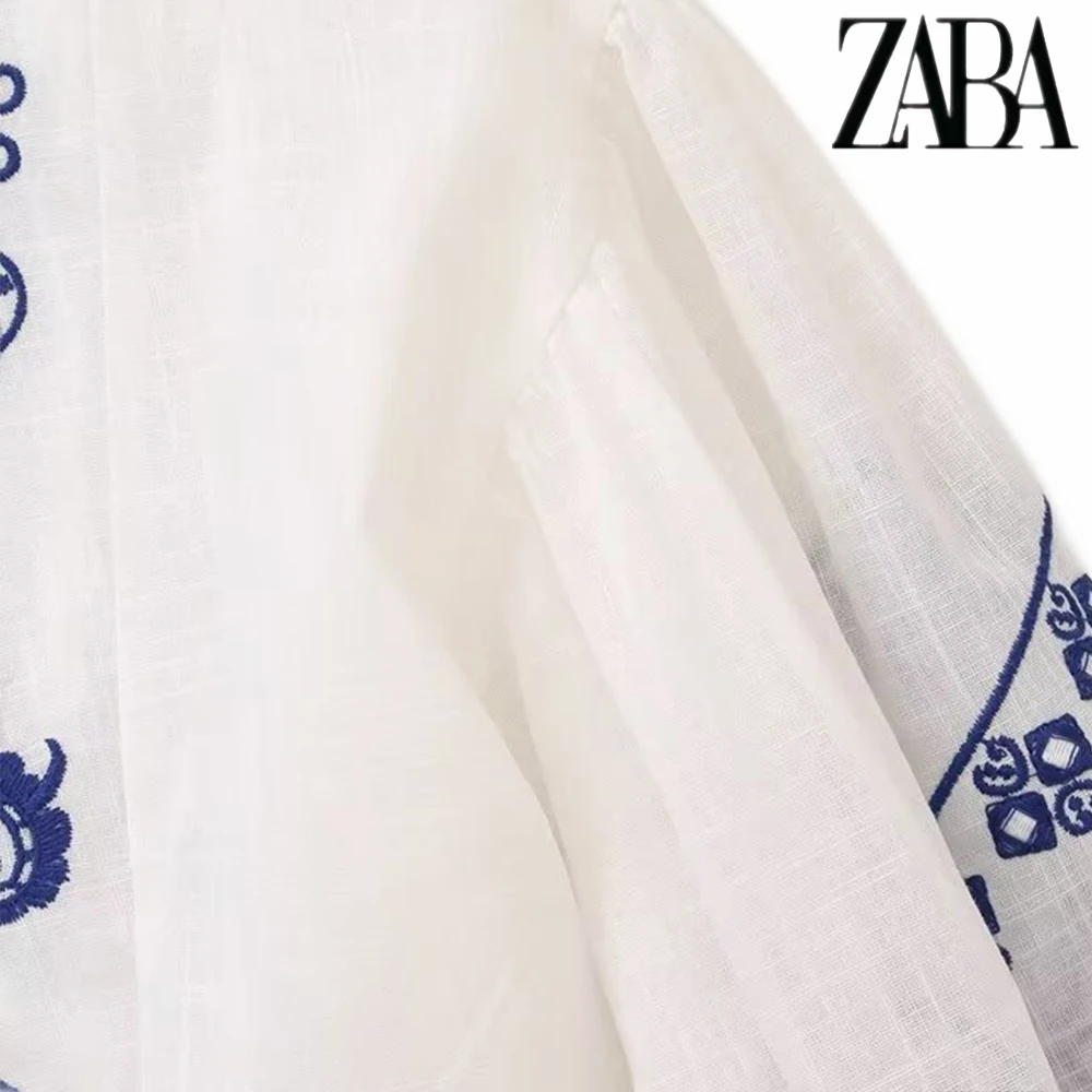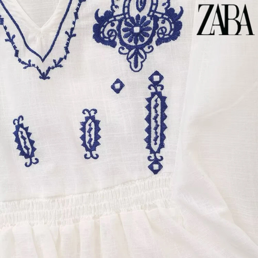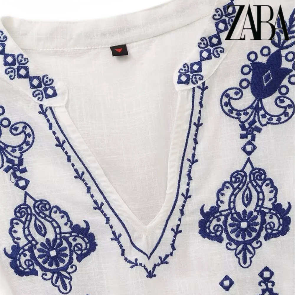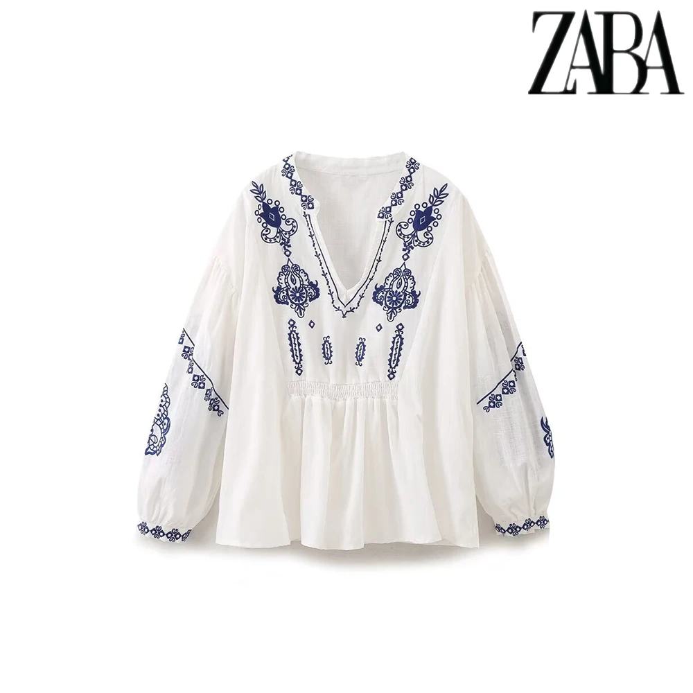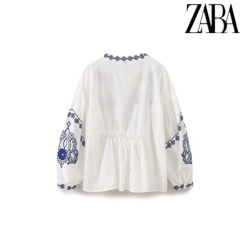 TRAF Women's Ethnic Style Embroidery Literature Long Sleeve Shirt Vintage Temperament V-Neck Women's Fashion Loose Peplum Shirt